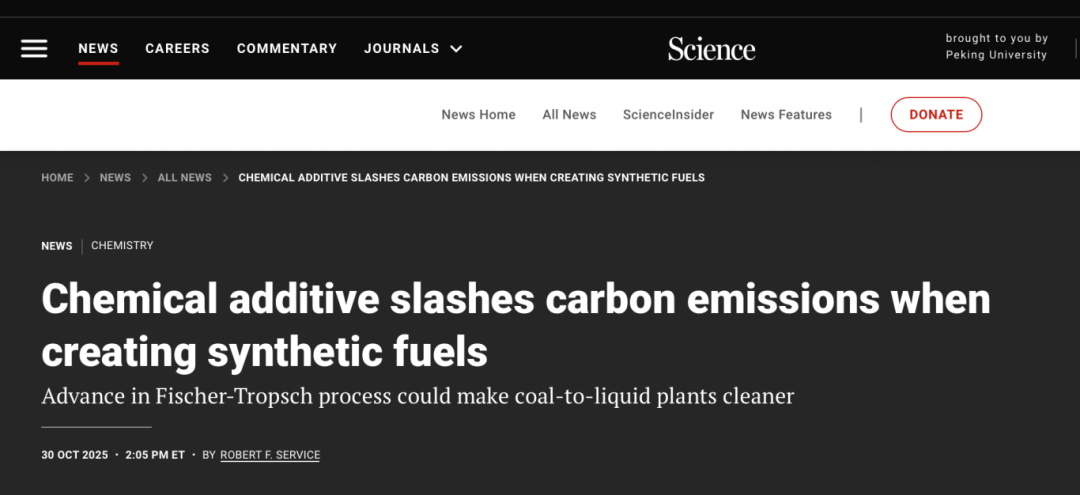 近日,由北京大学化学与分子工程学院马丁教授团队与中国科学院山西煤炭化学研究所主导的科研团队,通过向铁基费托合成(Fischer–Tropsch synthesis, FTS)反应气体中添加百万分之一(1/1000000)浓度的卤素化合物,成功将二氧化碳副产物从传统工艺的30%左右降至1%以下,实现“近零碳排放”,同时将高附加值烯烃产率提升至85%以上,为绿色合成气转化和低碳化工制造提供了新策略。这一突破性成果于2025年10月30日发表于《科学》(Science)期刊。